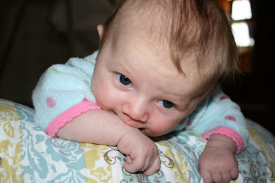 I took Zoe Jane to her 1 month check up yesterday. Our little girl is growing up so fast! She now weighs 9 lbs 5.5 oz (birth weight was 6 lbs 13 oz) and she is 21.25" long (19" at birth). I can't believe how much she has grown in a little over a month. I now have no worries at all that Zoe is getting enough to eat! She has really started to coo and "talk" and I love it! Her little sounds are so sweet!